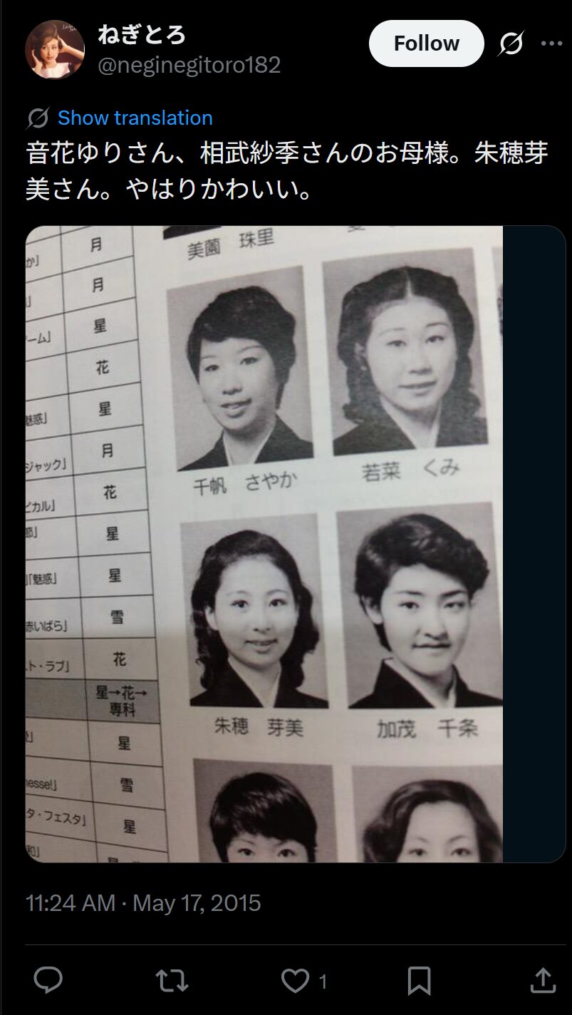 母の朱穂芽美さんは、星組で娘役をしていたそうで、活動時期は1976〜1982年まででした。以後は表舞台に出ておらず、相武さんが二世タレントと知らない人も多い様子です。